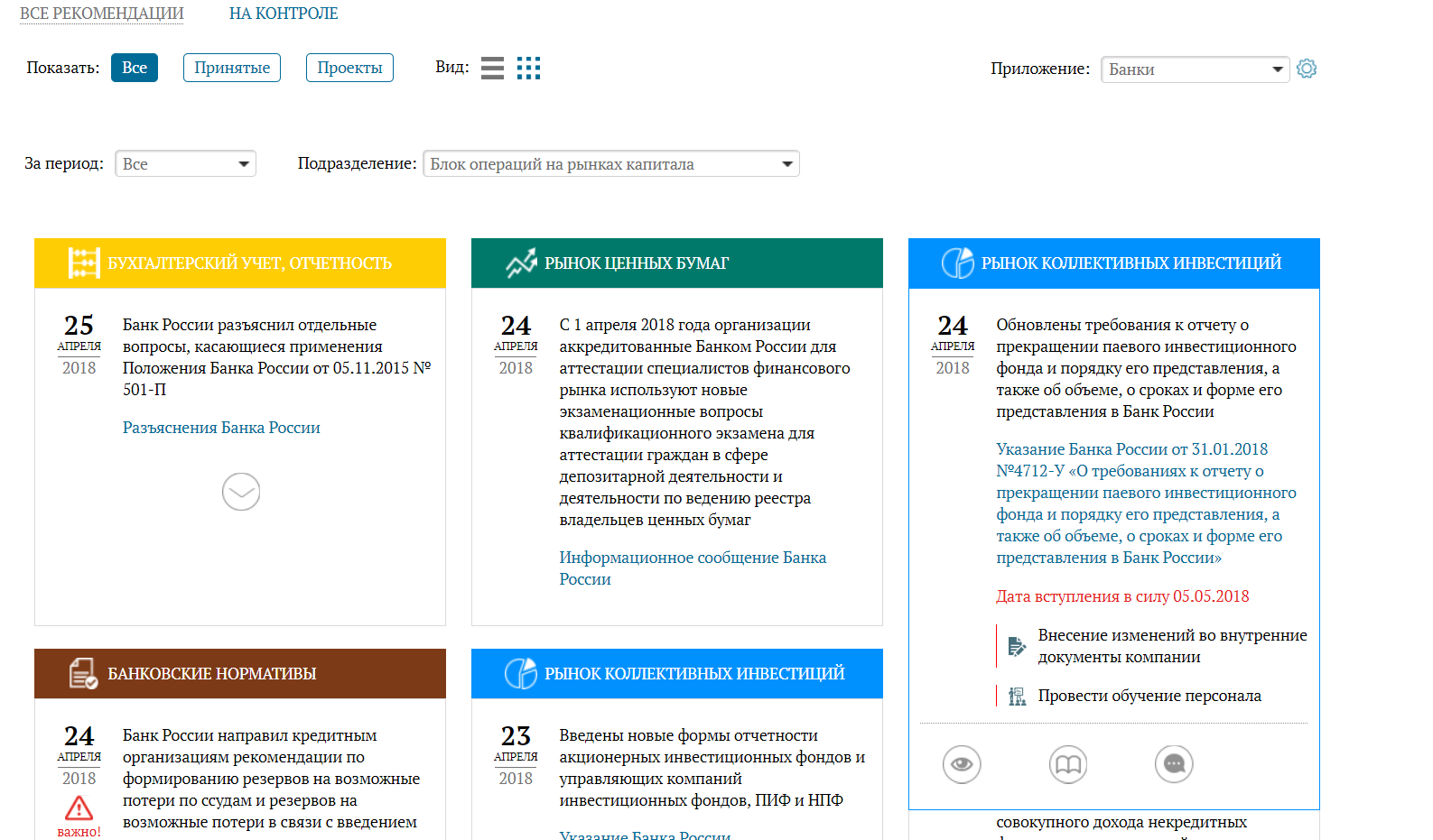 При выборе опции "На контроле" (находится в левом верхнем углу страницы) Пользователь из всей совокупности сообщений увидит лишь те, которые содержат рекомендации по проведению в организации работ, связанных с внесением изменений во внутренние нормативные документы, либо с проведением организационных, технических и иных мероприятий, которые должны рассматриваться как надлежащая мера реагирования на издание нового нормативного правового акта.