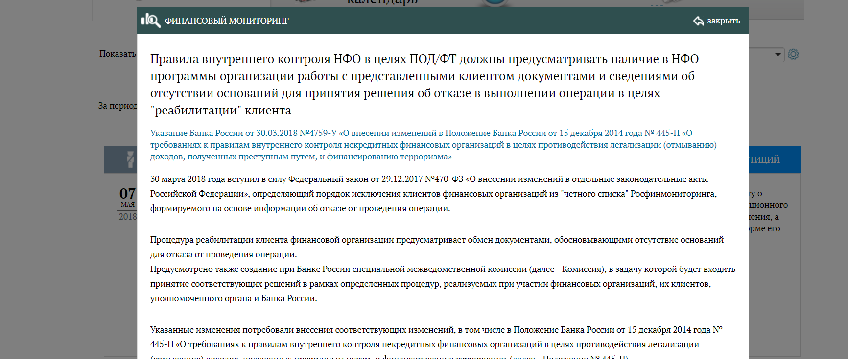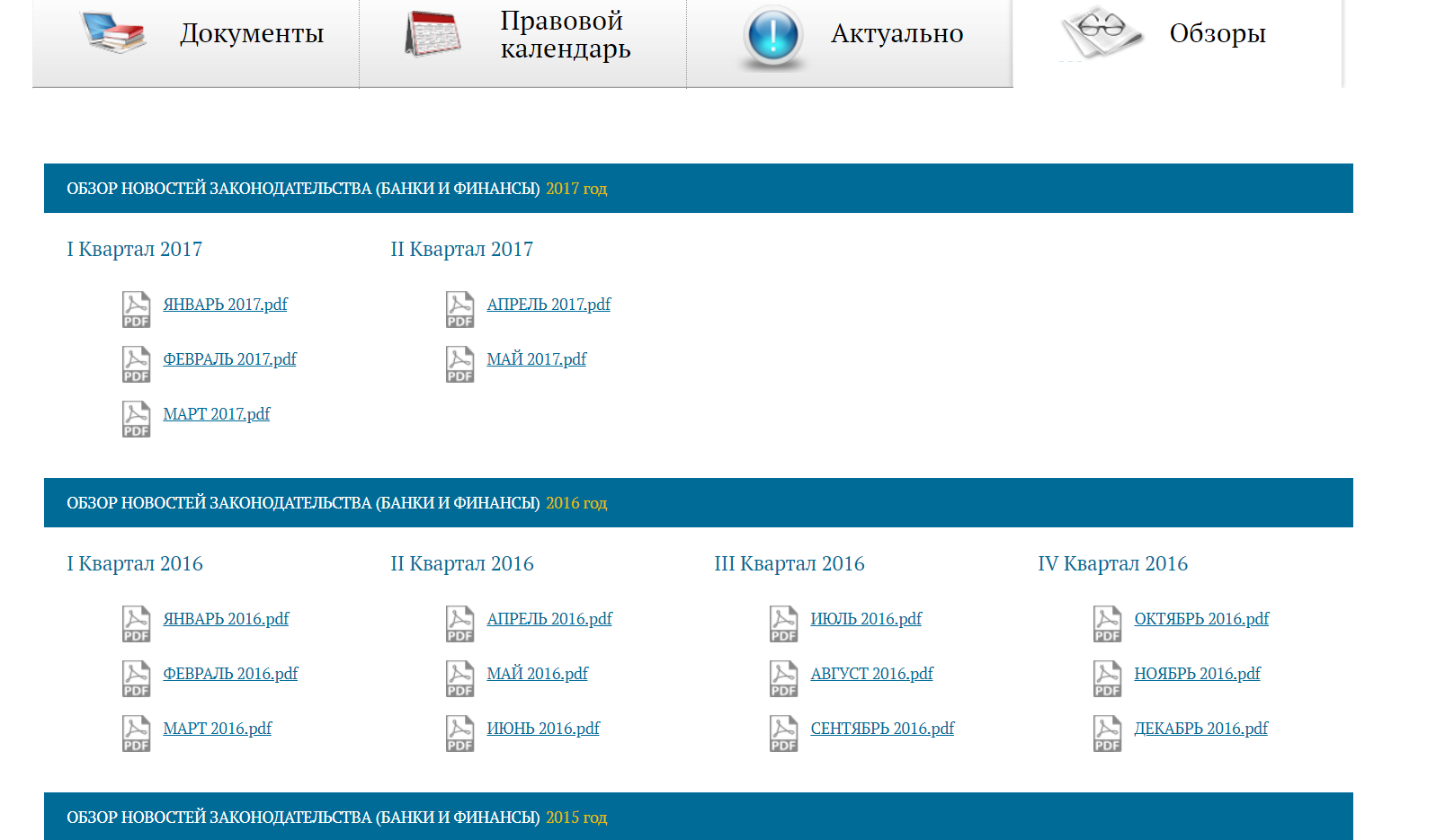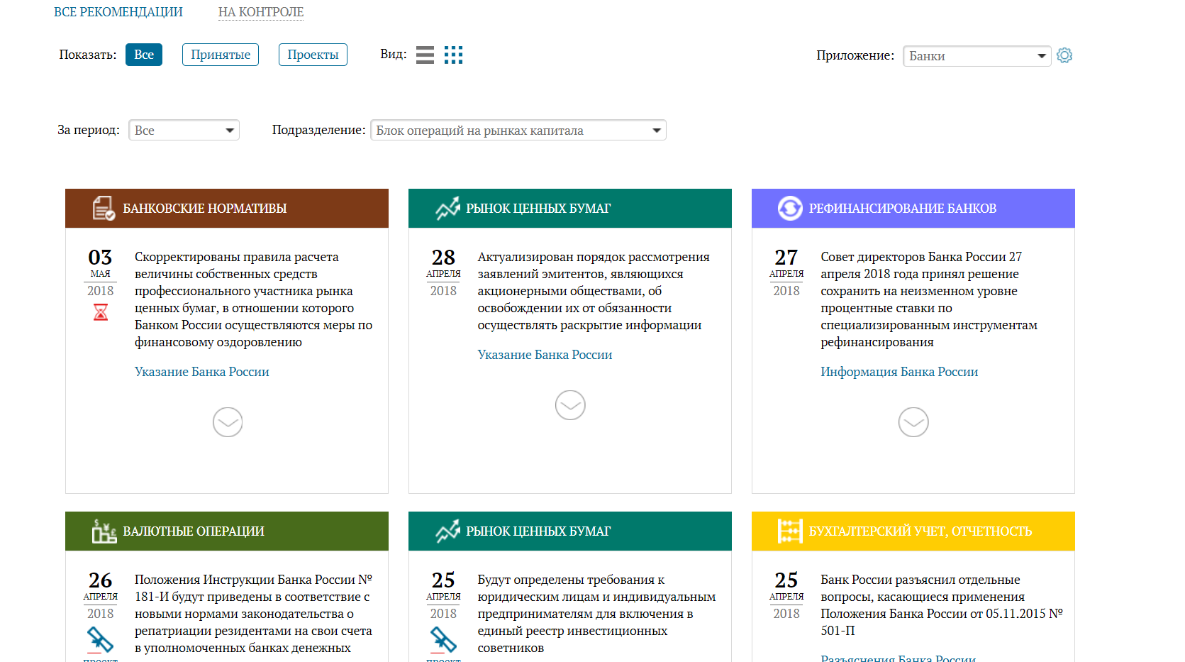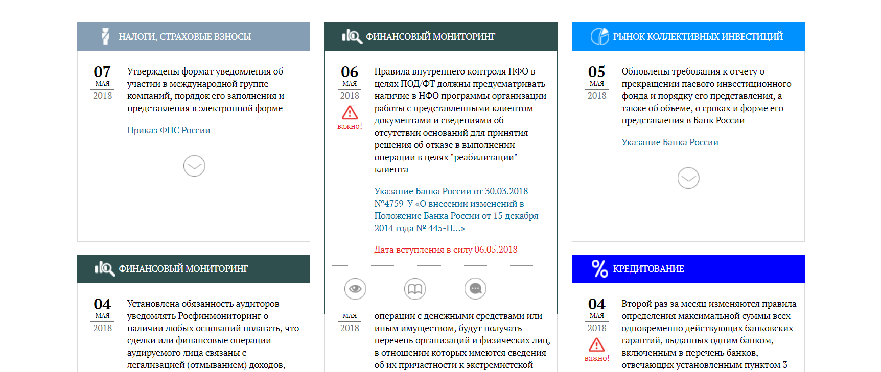 На странице "Актуально" представлена информация о новеллах законодательства и о проектах нормативных правовых актов, являющихся правовым окружением деятельности конкретного подразделения типовой организационной структуры финансовой организации.