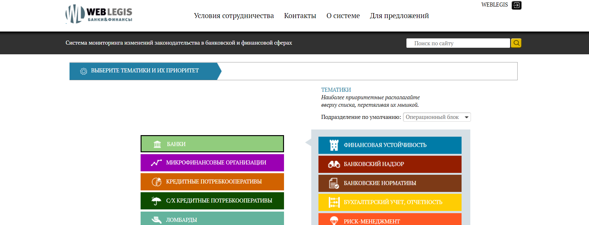 Пользователь выбирает также "Подразделение по умолчанию" - то подразделение типовой функциональной структуры финансовой организации, с которым связана деятельность Пользователя. Это необходимо для эффективного представления информации на странице "Актуально" - сообщения о новеллах законодательства и о проектах актов будут выстраиваться на указанной странице с учетом специализации Пользователя.