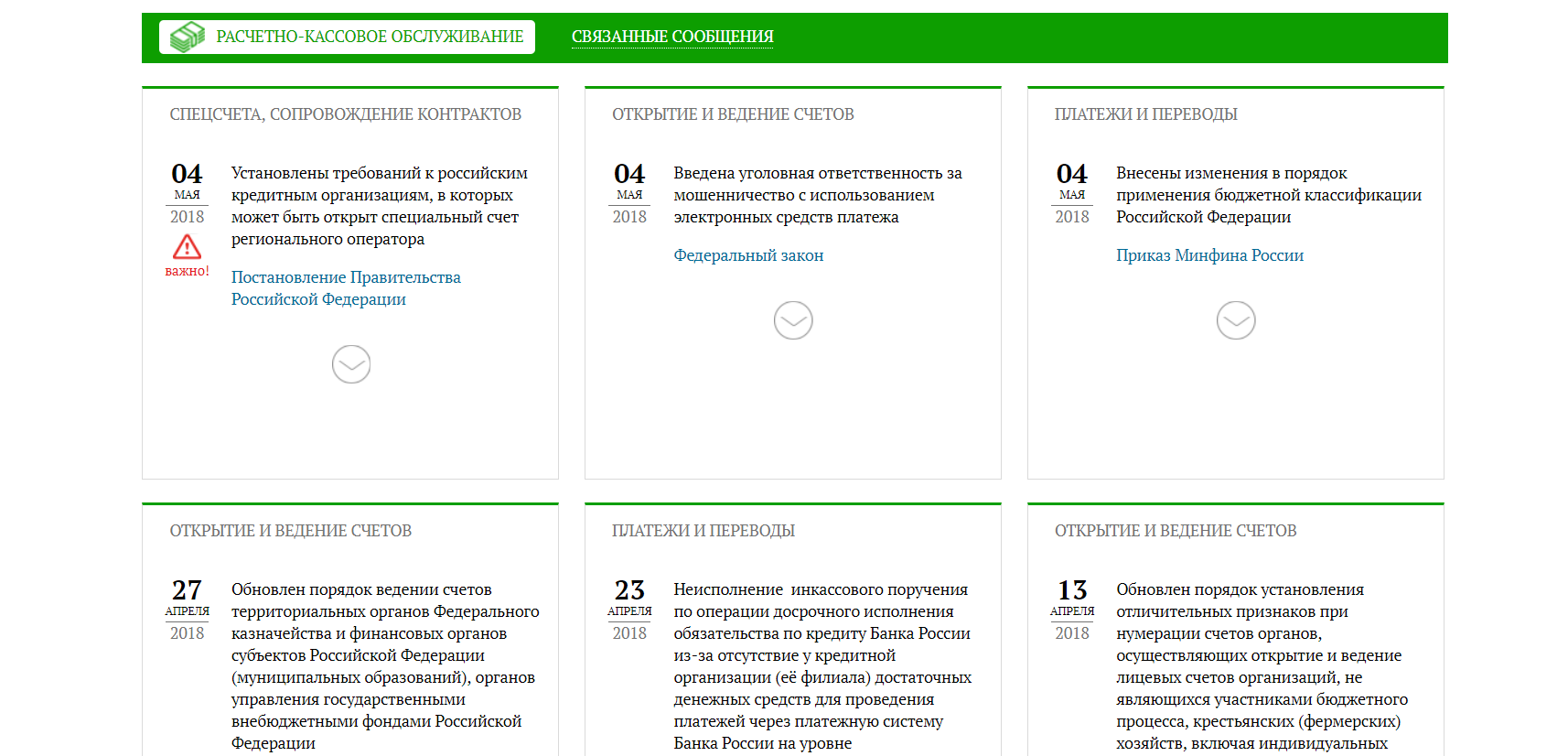 Пользователь может использовать самые разные фильтры для ознакомления с сообщениями. Например, при выборе тематики "Расчетно-кассовое обслуживание" в опции "Тематика", расположенной в центре страницы, Пользователь видит на экране только те сообщения, которые относятся к выбранной тематике:
