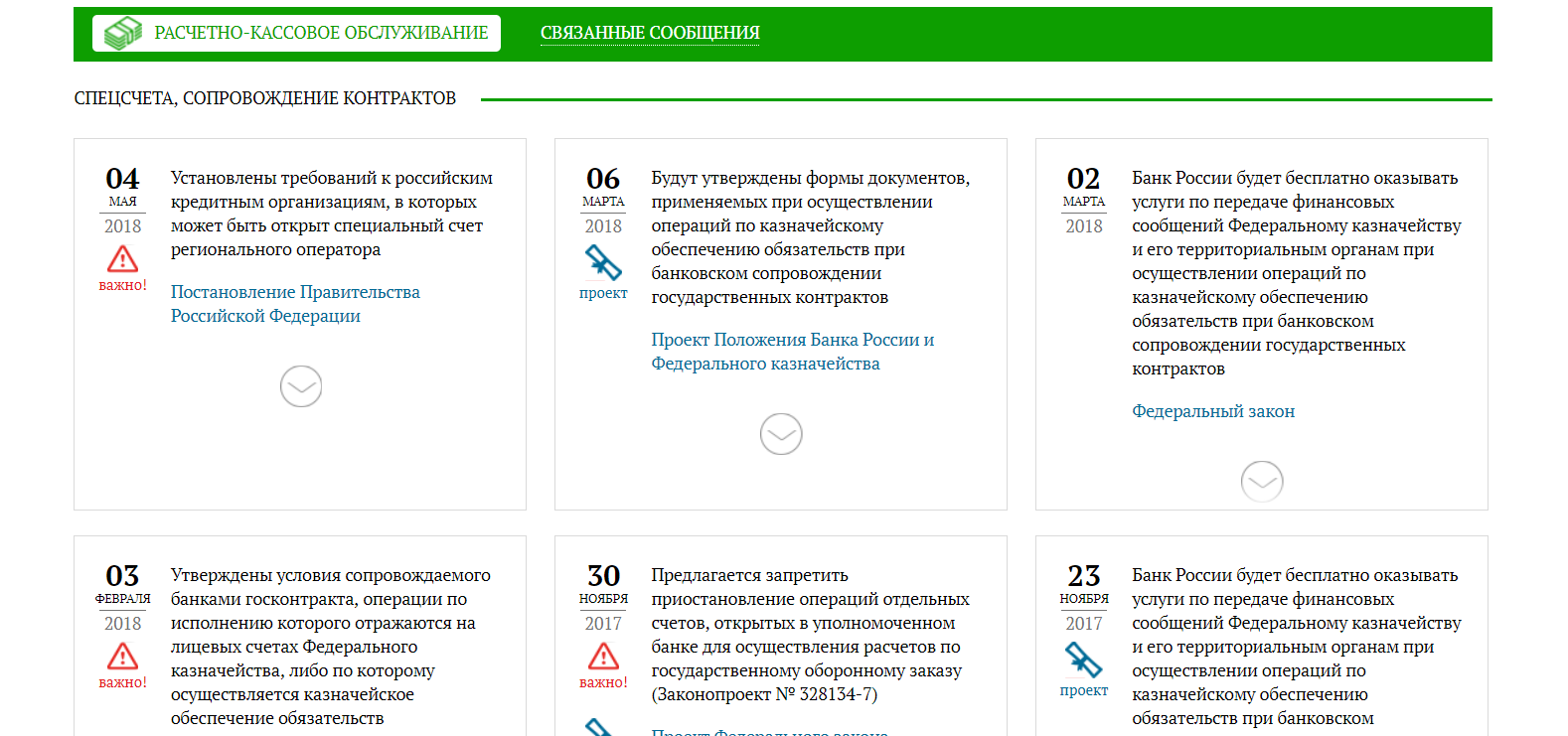 Для просмотра сообщений о новеллах, относящихся к какому-либо разделу выбранной тематики (например, в тематике "Расчетно-кассовое обслуживание" имеются разделы: "Открытие и ведение счетов", "Платежи и переводы", "Спецсчета, сопровождение контрактов", "Кассовые операции") Пользователь выбирает интересующий его раздел и видит только те сообщения, которые принадлежат к данному разделу. В представленном выше примере, выбрав раздел "Спецсчета, сопровождение контрактов", Пользователь видит следующую информацию: