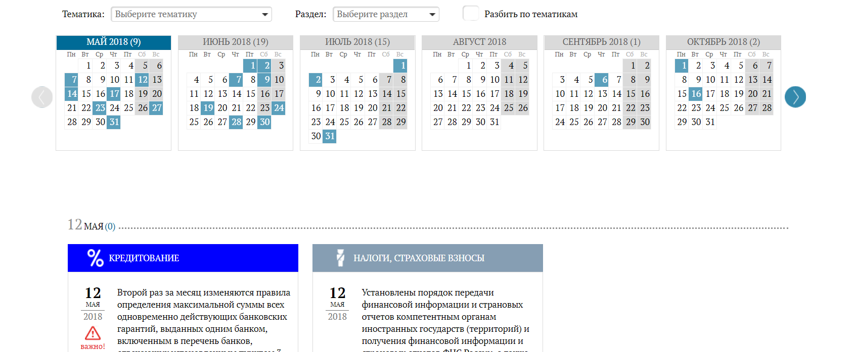 Выбрав опцию "Правовой календарь", Пользователь попадает на страницу, где представлена инормацию о предстоящем вступлении в силу нормативных правовых актов, либо отдельных норм таких актов: